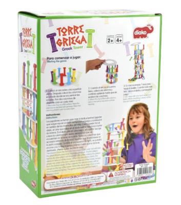El juego consiste en quitar las columnas del color que el dado indique, colocándolas en la parte superior, trata de hacer la torre más alta sin derribarla. Contiene: 13 aros, 60 columnas de 5 colores diferentes y 1 dado. Tamaño de la Caja: 21 x 10 x 28 cm.