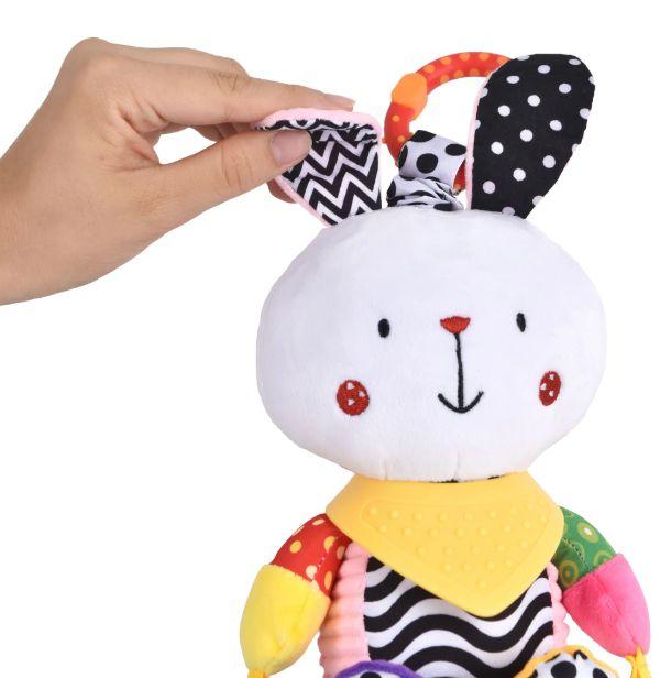 Sonaja Conejo Baby, diferentes colores, texturas y actividades. Con cada actividad ayuda a la identificación de sonidos, estimula el desarrollo sensorial, la identificación de colores y la coordinación. Tamaño: 31 x 15 cm. Recomendado para 3+ Meses