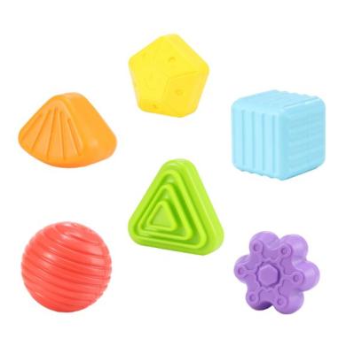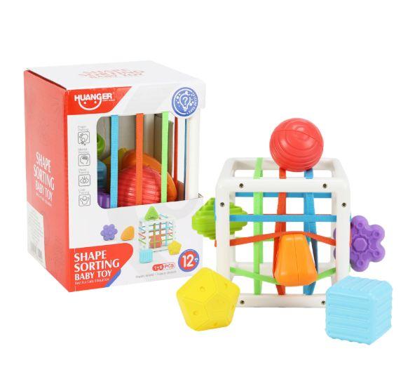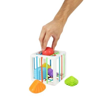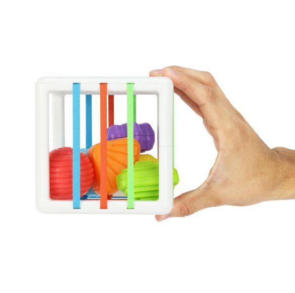 Contenedor sensorial con banda elástica, contiene 6 formas diferentes como el círculo, el cuadrado, la estrella y el triángulo, de colores brillantes y cada exterior de las figuras está diseñado con diferentes texturas. Tamaño del contenedor de bloques 12 x 12 x 12 cm. Las figuras desiguales son de aproximadamente 5 cm cada una. Recomendado para 12+ Meses
