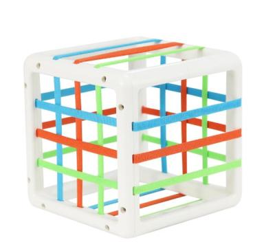 El niño pone los bloques en el contenedor con ambas manos a través de la banda elástica. Lo que profundiza su curiosidad, lo inspirará a tomar la iniciativa de explorar, probar y encontrar más diversión, las figuras tienen diferentes formas para estimular el interés y mejorar la capacidad de agarre.