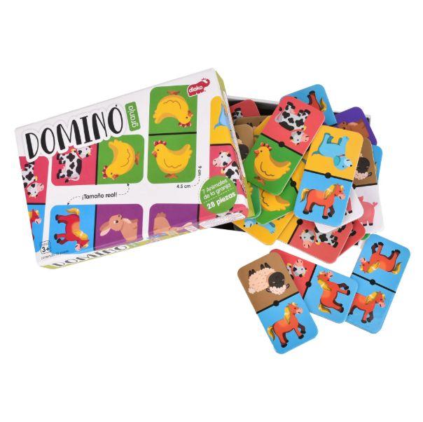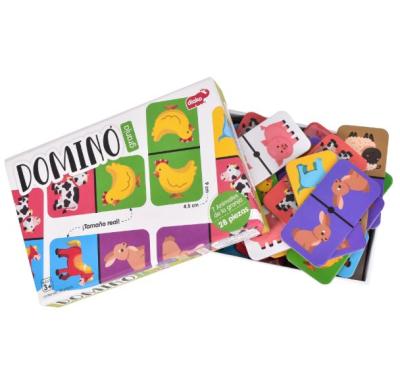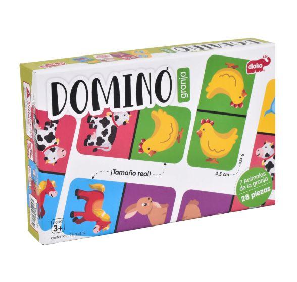 Dominó con imágenes de animalitos de la Granja, fabricado en cartón rígido plastificado. Tamaño de la caja: 16x12x4.5 cm. Contiene: 28 Piezas. Edad Recomendada: 3+ Años